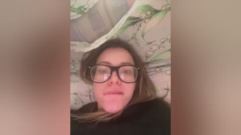 hmura24 - A video shows a fair-skinned woman with glasses and brown hair lying on a bed with floral-patterned sheets, looking relaxed.